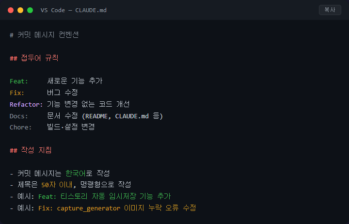 실전에서 효과적으로 활용하려면 CLAUDE.md 파일에 커밋 메시지 규칙을 추가하는 게 핵심입니다. 예를 들어 "커밋 메시지는 한국어로 작성하고, 50자 이내로 요약하며, 변경 유형을 접두어로 붙인다"와 같은 규칙을 적어두면 됩니다. CLAUDE.md는 Claude Code가 프로젝트 진입 시 자동으로 읽는 설정 파일입니다. 한 번 작성해두면 이후에는 별도 지시 없이도 원하는 형식으로 메시지가 생성됩니다.